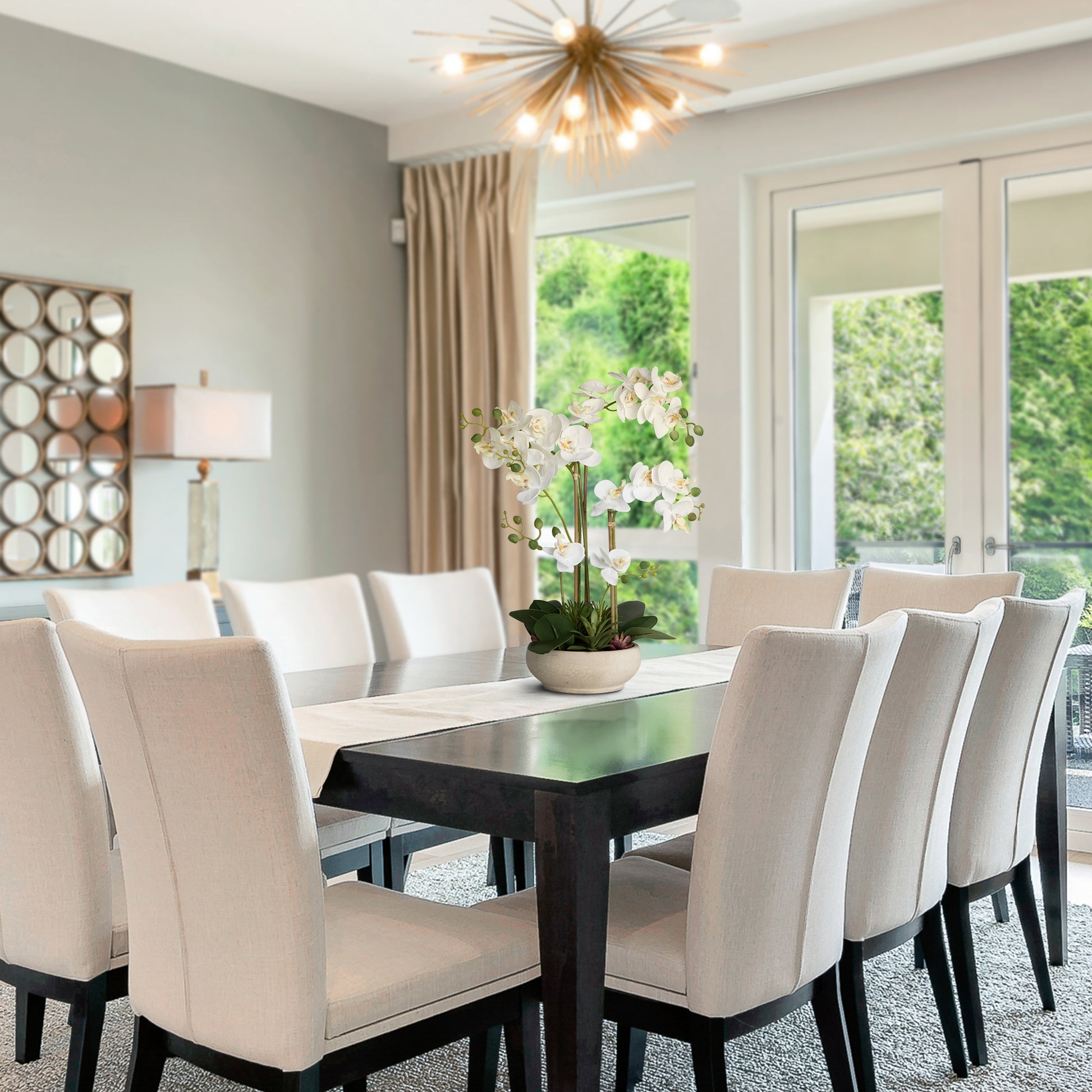 - Protection: Use coasters or placemats to prevent damage from hot or wet items.Brings the timeless elegance of blooming orchids into your home. Our White Silk Orchid Arrangement is meticulously crafted for those who love the beauty of artificial plants that look real. Inspired by the delicate grace of spring orchids, each stunning bloom features five silk petals radiating from a soft yellow center, capturing nature's perfection. Nestled in a classic beige melamine pot, this faux flower arrangement is designed to complement any interior, from modern living rooms to cozy bedrooms. It's the perfect artificial plant for home decor, ideal for anyone seeking high-quality faux spring arrangements or durable artificial plants indoor.